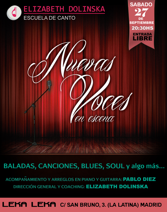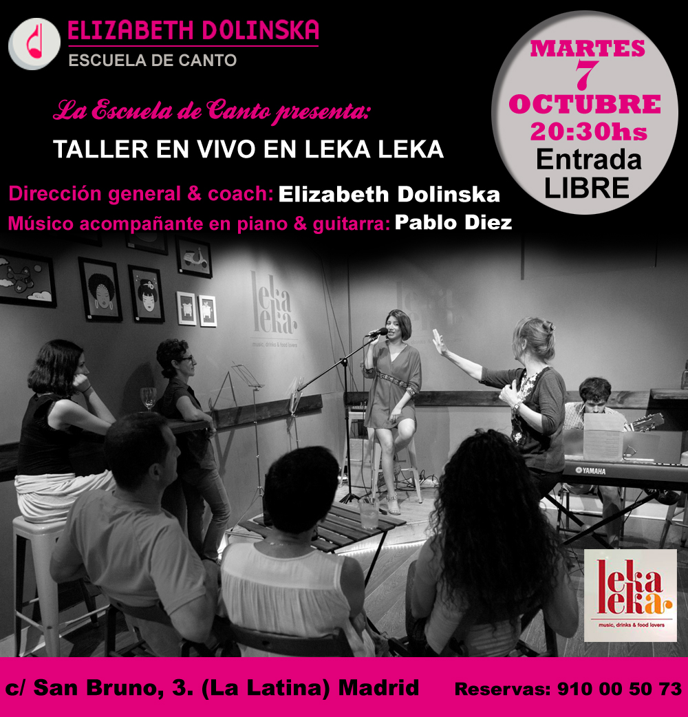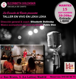 Para el 16 de septiembre a las 20:00hs, estamos organizando nuestro próximo taller en vivo en el LEKA LEKA, c/ San Bruno,3 (La Latina). Allí los futuros cantantes podrán presentar sus propuestas y sus proyectos musicales, contando con la dirección como coach de Elizabeth Dolinska y la marcación de técnica vocal de la cantante Jimena Ledesma.