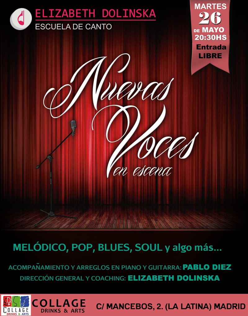 El martes 23 de Diciembre a las 20:30hs estaremos en “COLLAGE Drinks & Arts” con nuestro taller escénico en vivo. Como siempre la dirección y coaching estará a cargo de Elizabeth Dolinska y acompañando a los cantantes en piano y guitarra estará el músico Pablo Diez. Brindis y Taller de Canto para cerrar el año y recibir las navidades!! La entrada es gratuita, los esperamos!!!